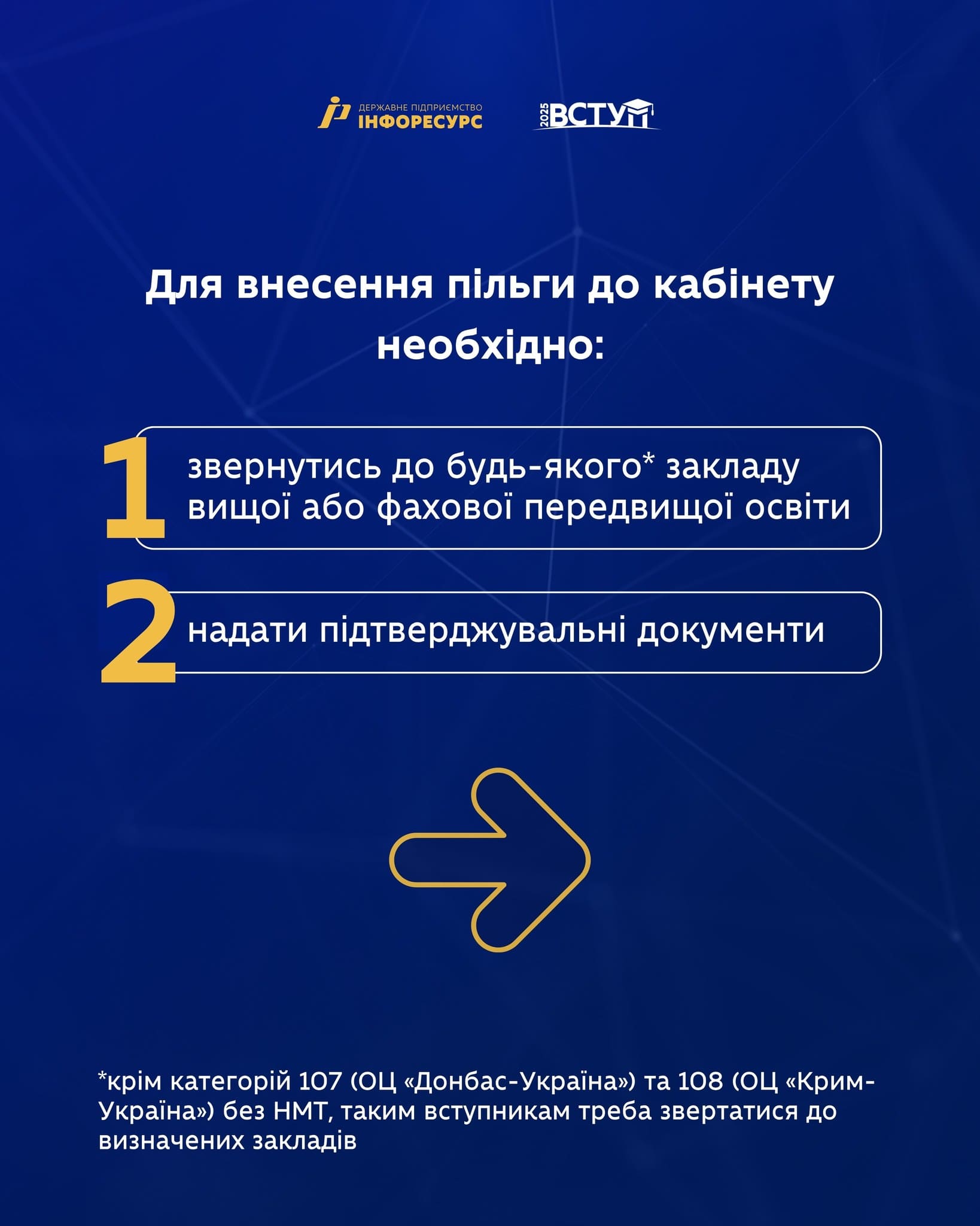 Для вступників пільгових категорій існують особливості створення електронних кабінетів. Перед створенням кабінету (або перед поданням першої заяви) вам необхідно звернутись до будь-якого державного закладу вищої освіти з проханням зареєструвати вас в Єдиній державній електронній базі з питань освіти - ЄДЕБО у реєстрі "Особи зі спеціальними умовами вступу". Цей реєстр є єдиним для всієї України.
