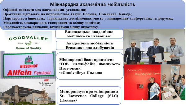 - Стажування і практика в Україні та за кордоном (Польща, Німеччина, Італія, Канада)