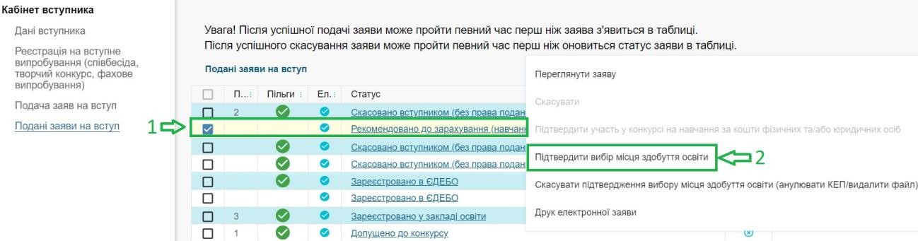 1. Для підтвердження вибору місця навчання в модулі «Подані заяви на вступ» виділіть позначкою потрібну заяву та натисніть в меню «Активні дії» - «Підтвердити вибір місця здобуття освіти»: