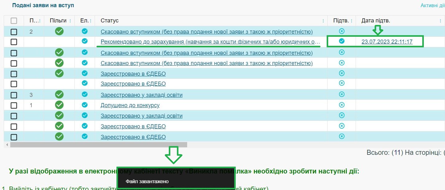 Увага! Після вказаних дат завантаження файлів на бюджет, зокрема, використання КЕП, в електронному кабінеті неможливе, оскільки вступник не виконав вчасно вимоги до зарахування на бюджет.