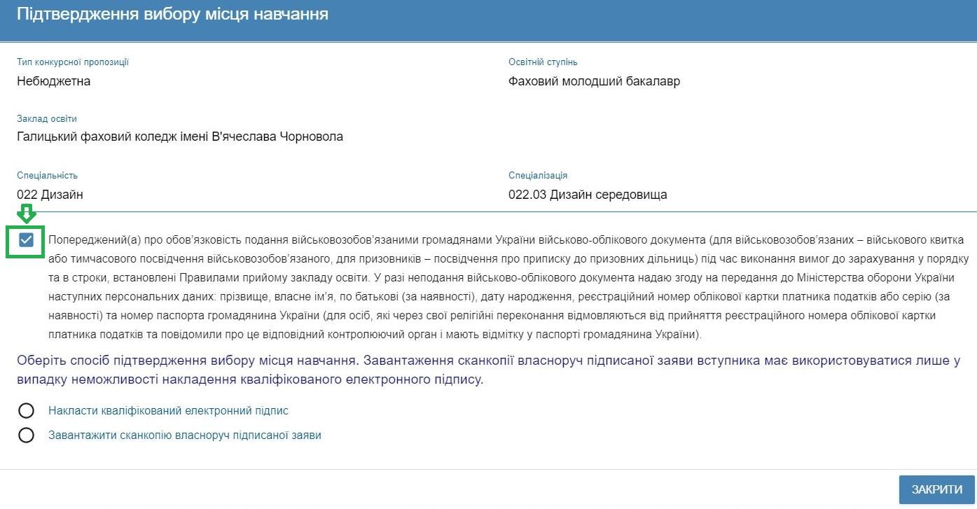 2. У вікні «Підтвердження вибору місця навчання», що відкрилося, обов’язково заповніть відмітку «Попередження про обов’язковість подання військовозобов’язаними громадянами України військово-облікового документа». Відмітка має інформативний характер та є обов'язковою для встановлення усім вступникам незалежно від статі: