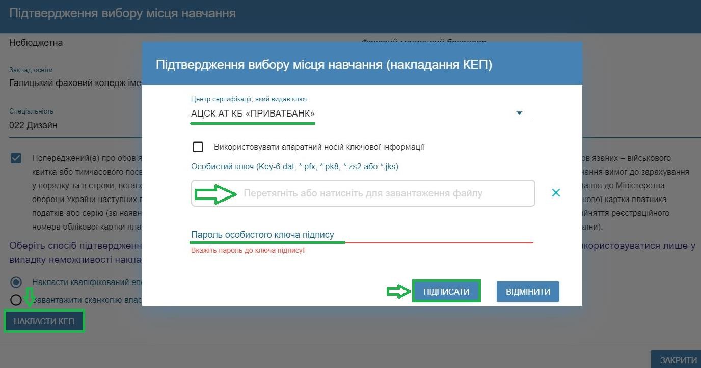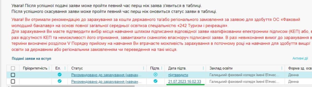 Після перевірки та погодження зазначених вище документів з накладеним КЕП в електронному кабінеті вступника з’явиться відмітка «Вступник підтвердив вибір місця навчання за цією заявою наклавши КЕП».
