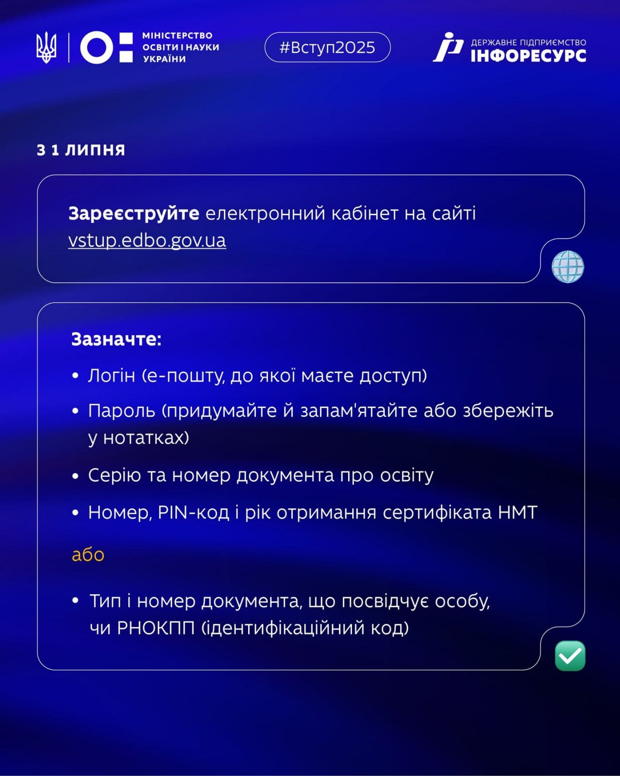 Для подання заяв в електронній формі вступник реєструє особистий електронний кабінет в ЄДЕБО на вебсайті за адресою https://vstup.edbo.gov.ua/, крім випадків, визначених в Порядку прийому. Реєстрація електронного кабінету здійснюється на підставі реквізитів документа про здобуту освіту та сертифіката зовнішнього незалежного оцінювання/сертифіката національного мультипредметного тесту. Для підтвердження даних вступника (а також у разі відсутності сертифіката зовнішнього незалежного оцінювання / сертифіката національного мультипредметного тесту ) необхідно вказати додаткову інформацію за номером документа, що посвідчує особу: паспорт громадянина України, свідоцтво про народження, паспорт громадянина України для виїзду за кордон, або реєстраційний номер облікової картки платника податків (РНОКПП).