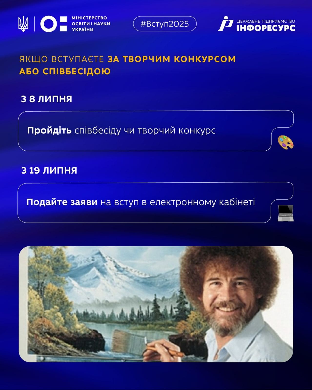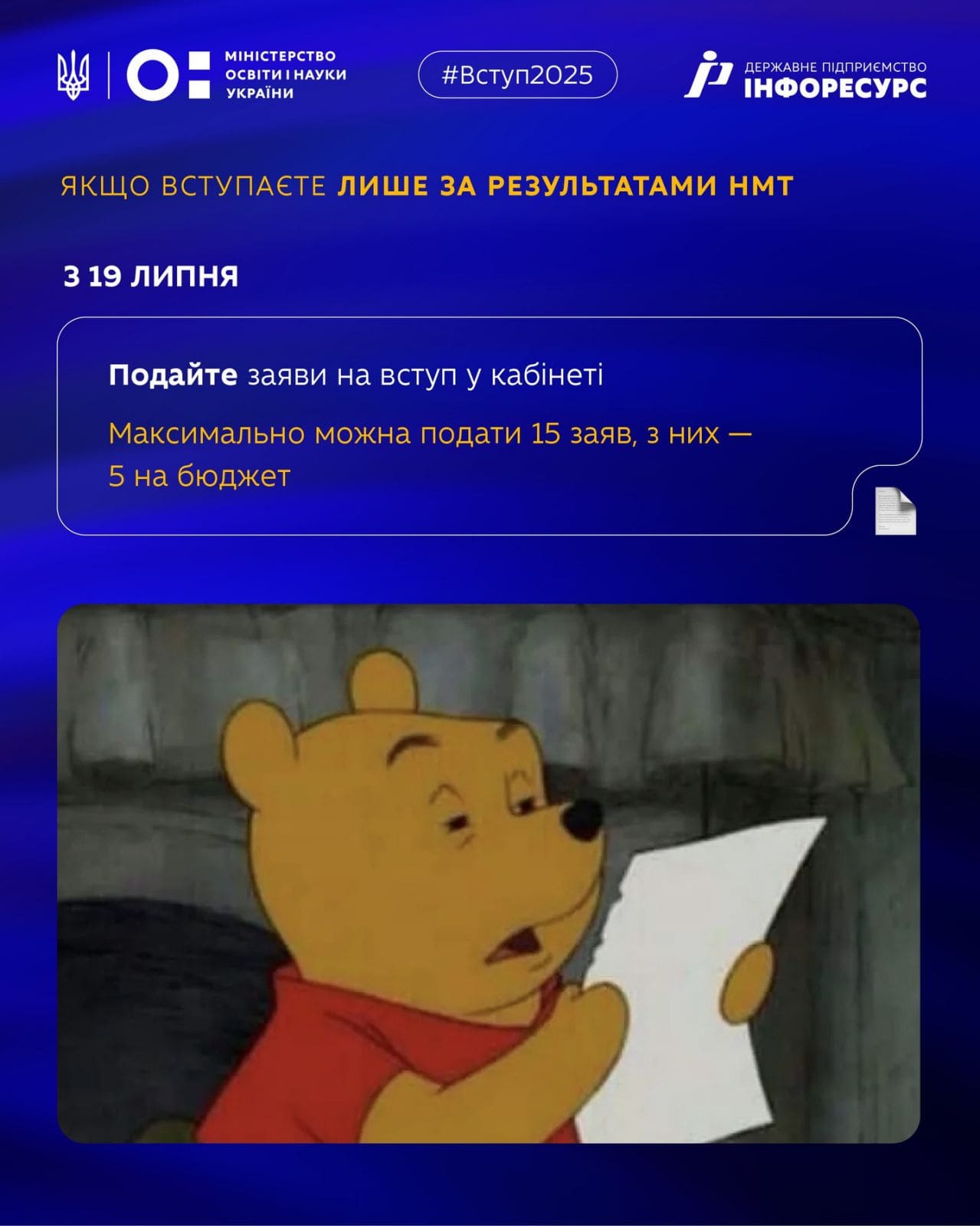 - замість результатів НМТ 2025 року, можна використати результати НМТ 2022, 2023 або 2024 року, чи матурального іспиту (результати 2024 року мають бути з чотирьох предметів, 2022 чи 2023 року - з трьох предметів. Детальніше - тут);
