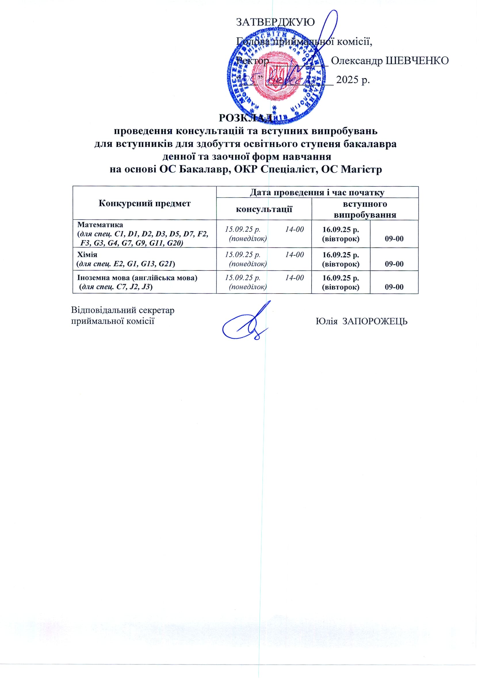 Розклад консультацій та вступних випробувань - 2025